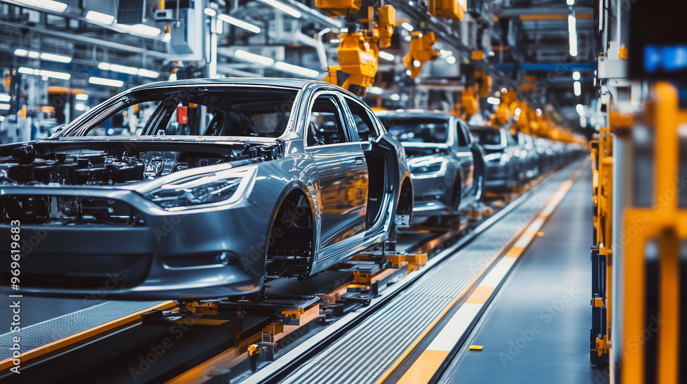 Fototapeta Pojazdy - W nowoczesnej fabryce samochodów, linia montażowa funkcjonuje pełną parą, tworząc nowoczesne... #969619683