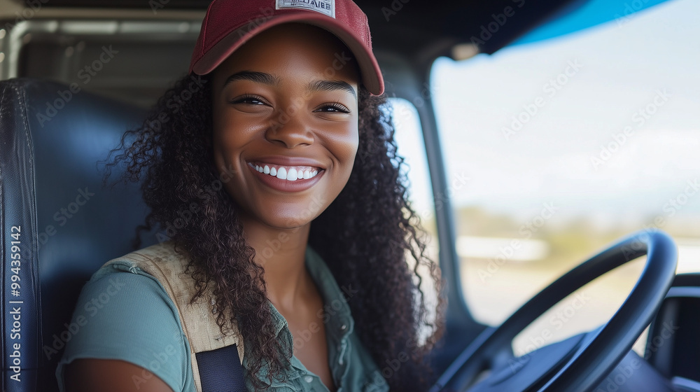 Fototapeta Pojazdy - Kierowczyni ciężarówki z radosnym uśmiechem patrzy prosto w kamerę, siedząc w kabinie swojego... #994359142