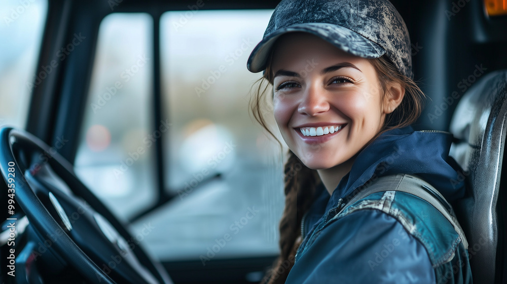 Fototapeta Pojazdy - Kierowczyni ciężarówki z radosnym uśmiechem patrzy prosto w kamerę, siedząc w kabinie swojego... #994359280