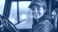 Kierowczyni ciężarówki z radosnym uśmiechem patrzy prosto w kamerę, siedząc w kabinie swojego pojazdu.