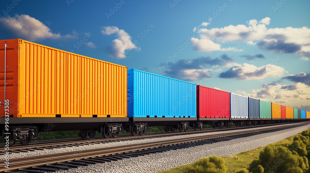Fototapeta Pojazdy - Na torach widać pociąg towarowy, który składa się z szeregów kontenerów, skrzętnie poukładanych... #996373305
