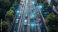 Z lotu ptaka ukazany jest skomplikowany układ dróg w futurystycznym mieście, z autonomicznymi pojazdami poruszającymi się po nowoczesnych trasach.