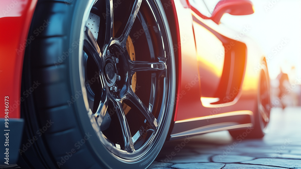 Fototapeta Pojazdy - Zbliżenie na luksusowe opony sportowego samochodu, na których wyraźnie widać imponujące tarcze... #999496073