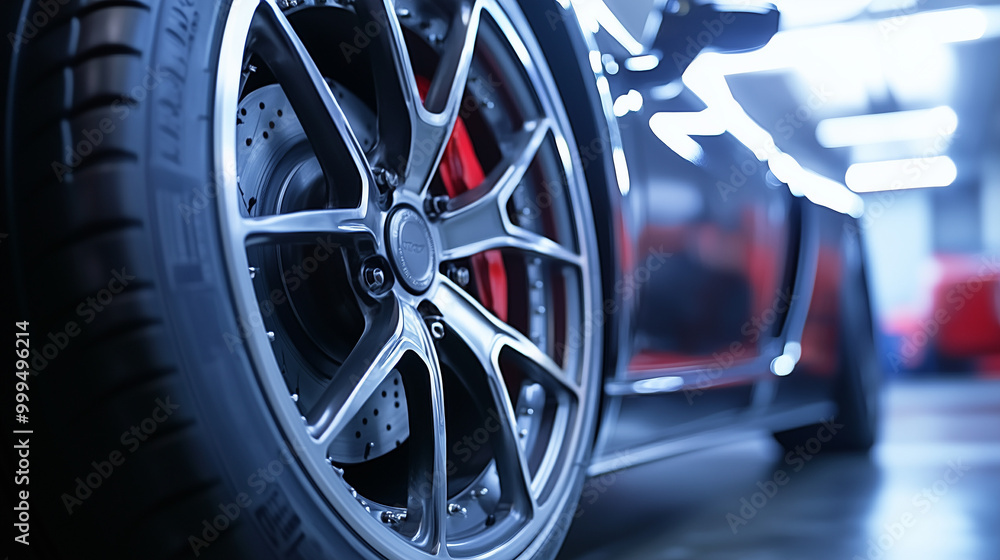 Fototapeta Pojazdy - Zbliżenie na luksusowe opony sportowego samochodu, na których wyraźnie widać imponujące tarcze... #999496214