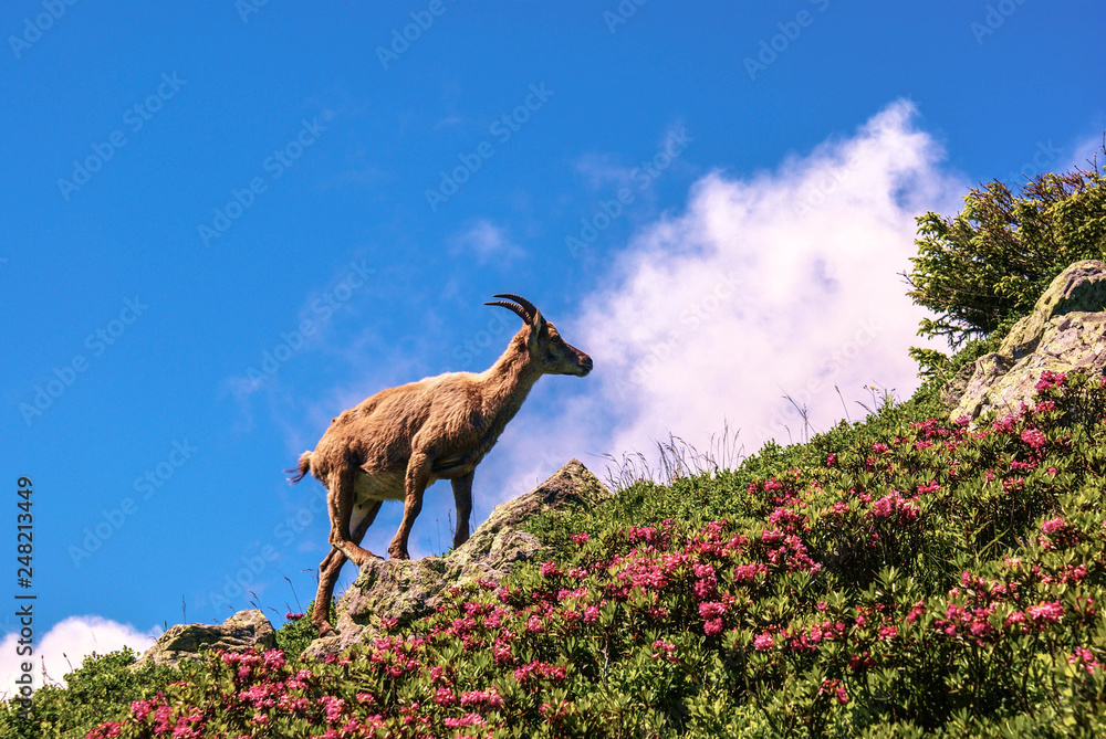 Fototapeta Zwierzęta - Kozica na górskim szlaku. Tour de Mont Blanc. Alpy, Szwajcaria, Europa #248213449