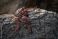 • Czerwony krab siedzący na skale na kamiennym naturalnym tle wybrzeża.