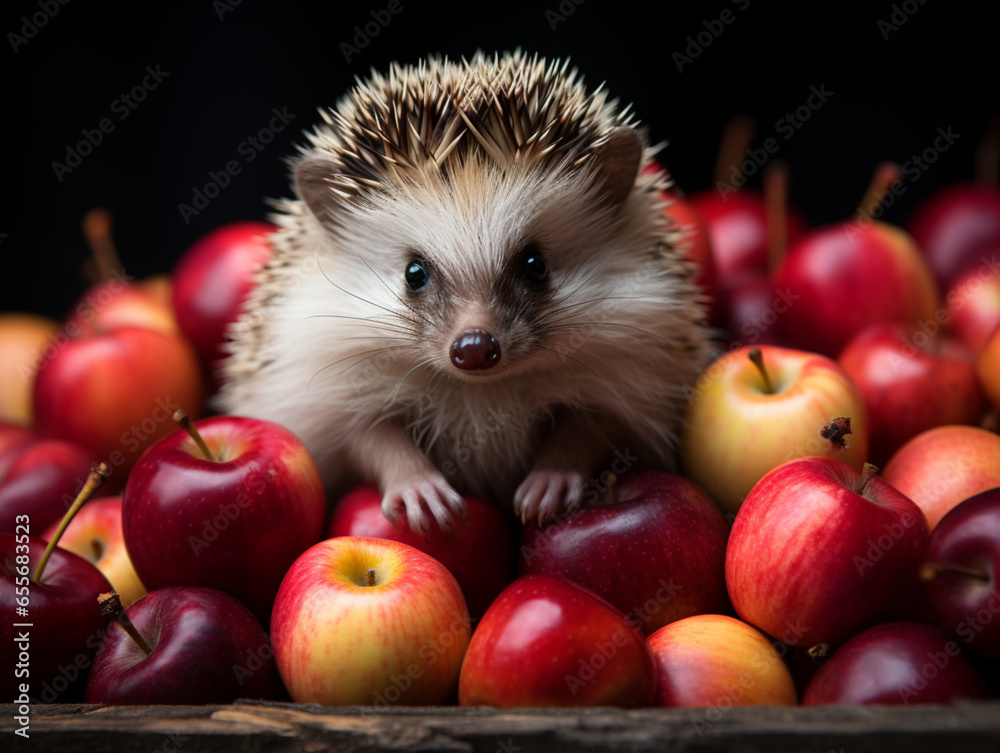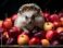• portret jeża siedzącego w dojrzałych czerwonych jabłkach.