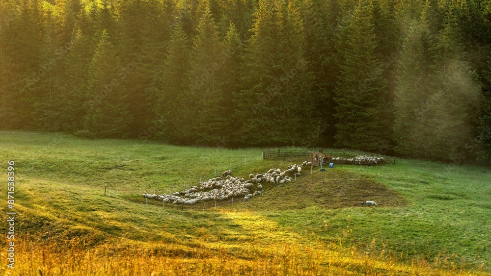 Fototapeta Zwierzęta - Wypas owiec w Tatrach na polanie w okolicy Kalatówek wczesnym porankiem #871538396