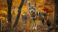 • Kojot w naturalnym środowisku, otoczonego jesiennymi liśćmi, uwidaczniające jego uważny i czujny wyraz twarzy w pięknym leśnym tle.