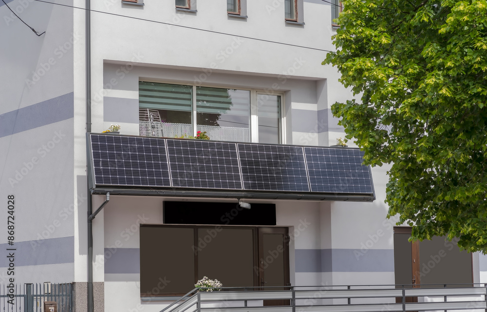 Obraz Architektura - Słoneczna „elektrownia” na balkonie, fotowoltaika w mieście. Panel fotowoltaiczny wytwarzający... #868724028