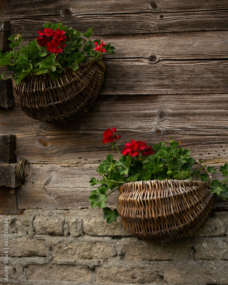Obraz Kwiaty - kwiaty w koszach wiklinowych #607531848