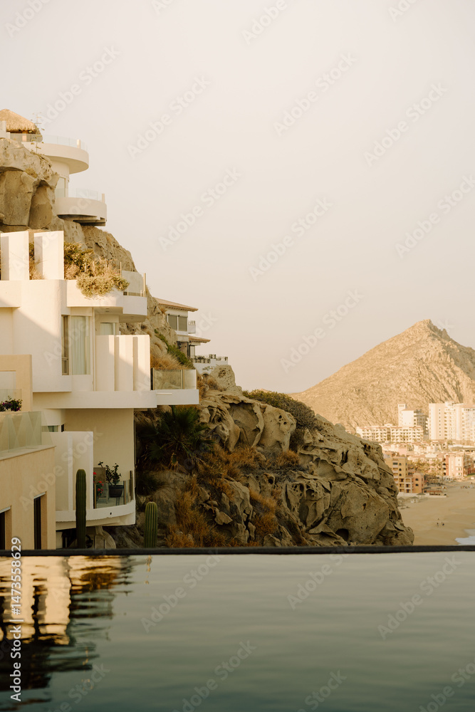 • Sunlit cliffside villas overlooking Cabo San Lucas coastline and sea