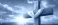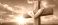 • Wooden cross with white linen cloth hangs under a vast sunset sky over desert hills, symbolizing hope and resurrection in Christian faith