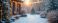 • Snow covered garden with festive lights and trees. Cozy winter day, warm glow from building lights and sunset. Outdoor nature setting with blurred elements.