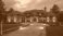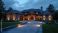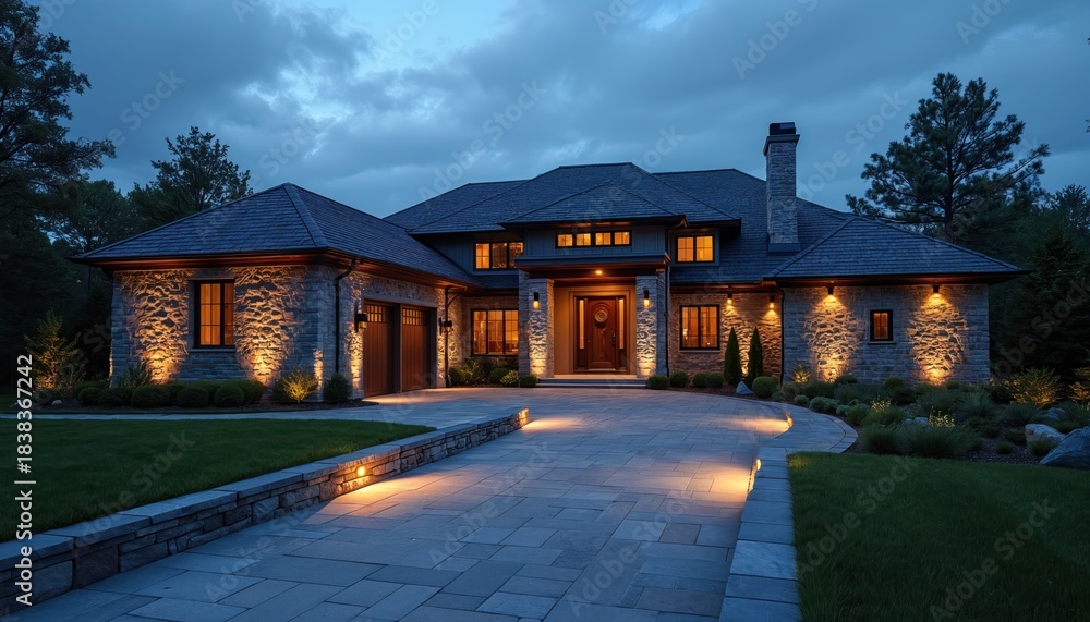 • Modern stone house with landscape lighting illuminated at dusk. The elegant residence features a long driveway, manicured lawn, and architectural details.