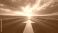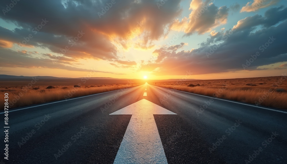 • Road leads to sunset with white arrow painted forward. Open landscape with dry grass and cloudy sky. Journey towards bright future and success.
