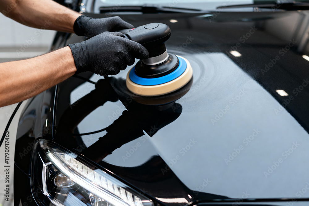 Obraz Pojazdy - Car detailing process: polishing a black car with a professional machine #1790917463