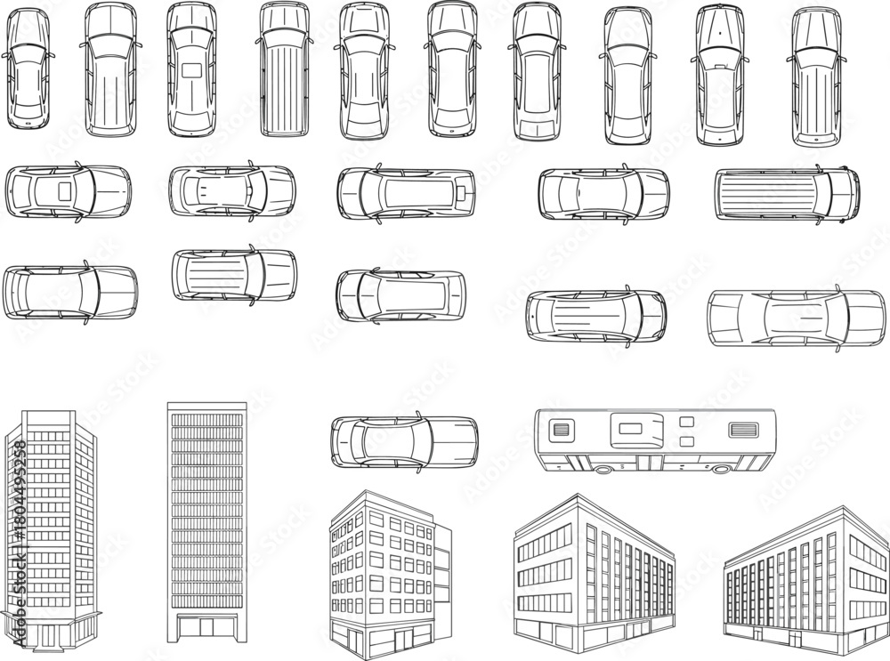 • Collection of vector car top views and modern building perspectives for architectural site plans and urban design layouts featuring black and white outline illustrations.