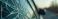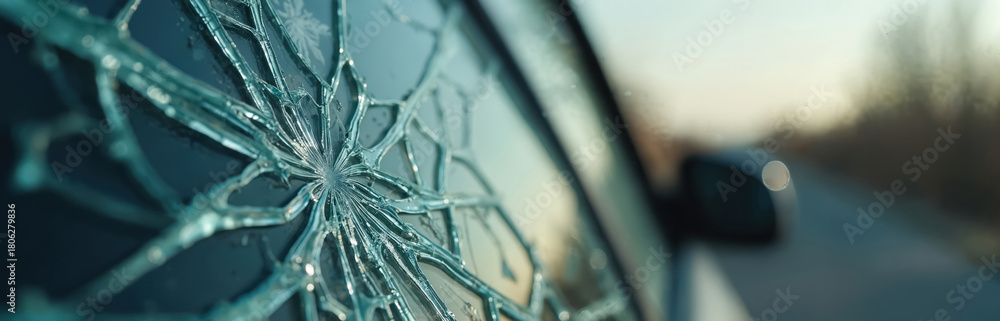 • Close up photo of crashed car windshield with broken glass. Accident damage shows shattered cracks after collision. Glass fragments are visible illustrating the impact force.