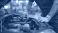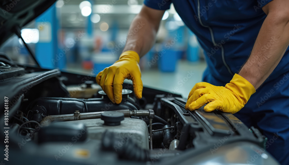 Obraz Pojazdy - Mechanic works on auto engine. Man in yellow gloves repairs car motor in garage. Engineer checks... #1810261187