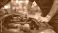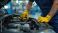 • Mechanic works on auto engine. Man in yellow gloves repairs car motor in garage. Engineer checks vehicle under hood. Auto service worker fixes automobile at station.