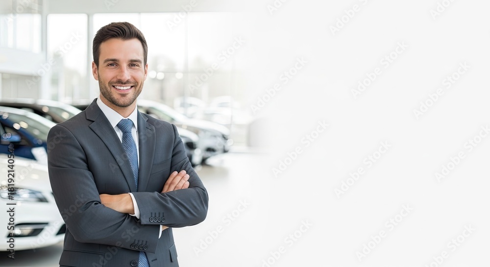 Obraz Pojazdy - A smiling man in a suit standing in a car showroom. #1819214054