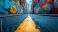 • A vibrant urban alleyway with colorful graffiti on walls, showcasing yellow line down center of wet street, evoking sense of creativity and urban life.
