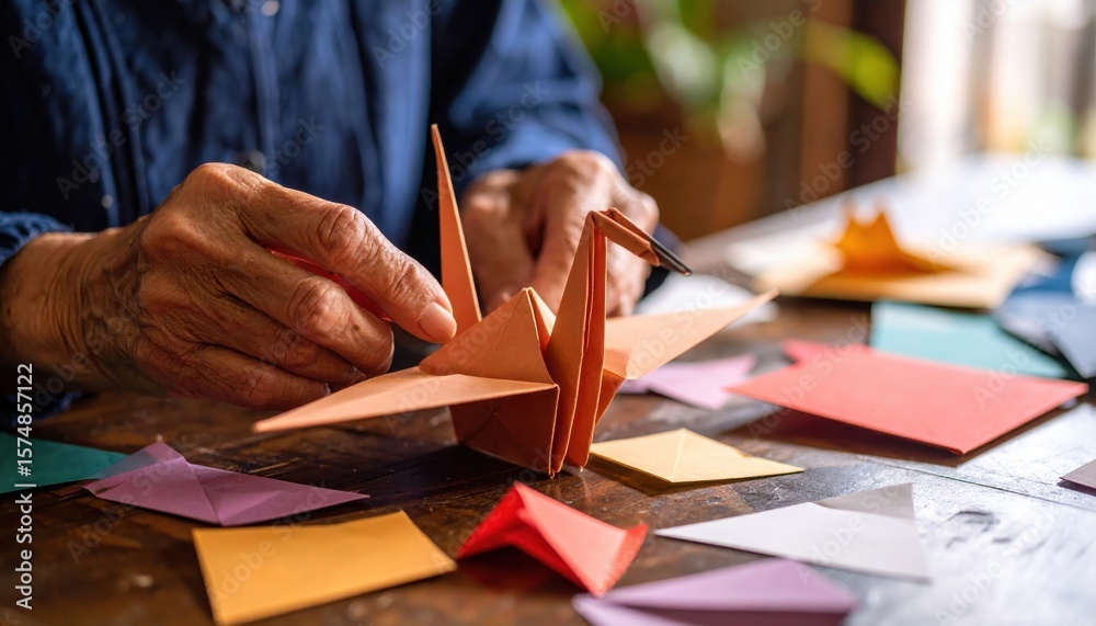Plakat Origami - Elderly person skillfully folding an orange origami crane surrounded by colorful paper squares #1574857122