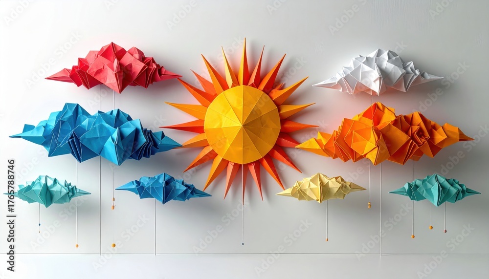 • Vibrant origami sun and colorful clouds create a whimsical, joyful sky for playful, creative projects and children's decor