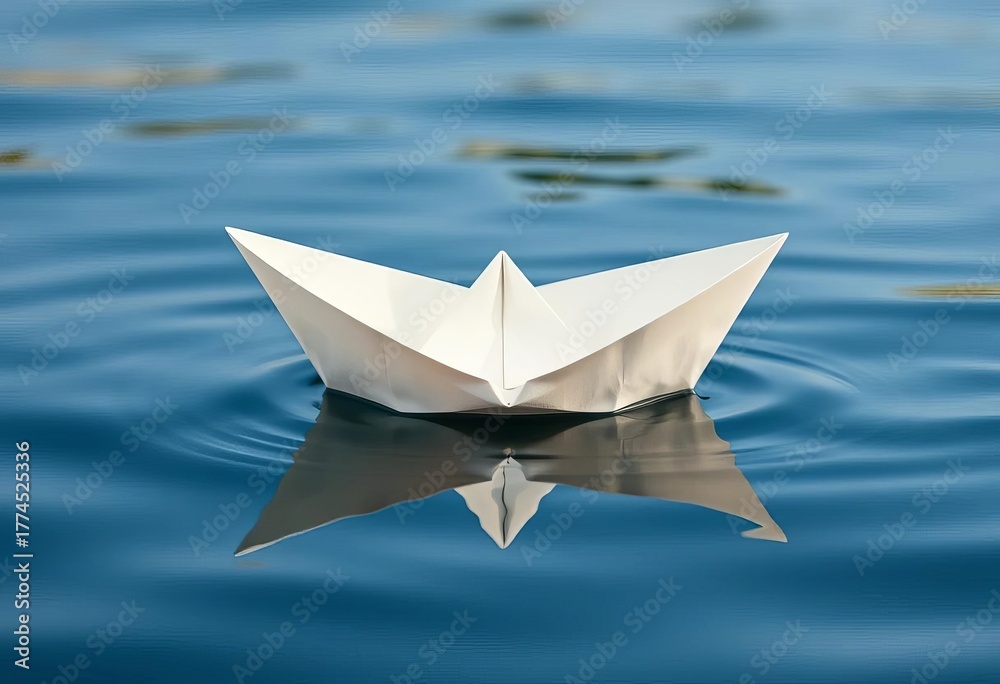 Plakat Origami - Small origami paper boat, pristine white, floating on calm water, close-up, paper boat #1774525336