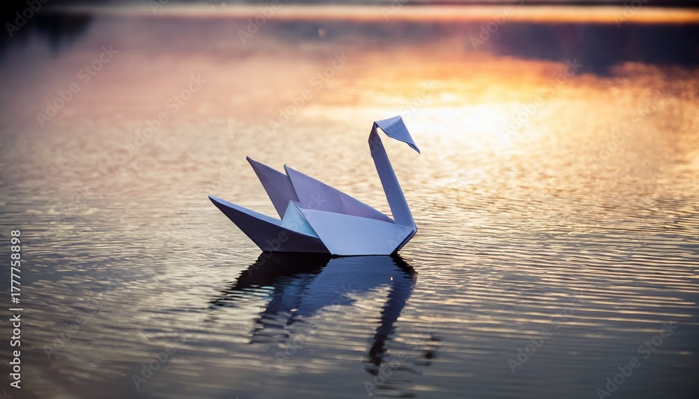Plakat Origami - dreamy origami swan floating peacefully on calm water surface #1777758898