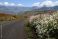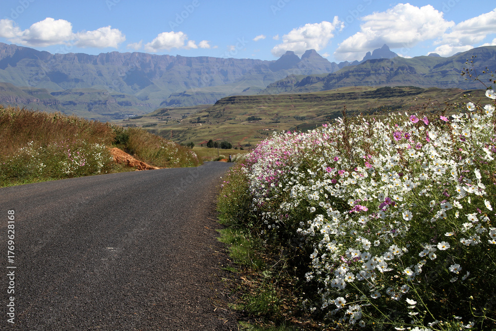 • Tar road and cosmos flowers in the foreground. Traditional QwaQwa houses and the Drakensberg mountains in the back ground. South Africa.