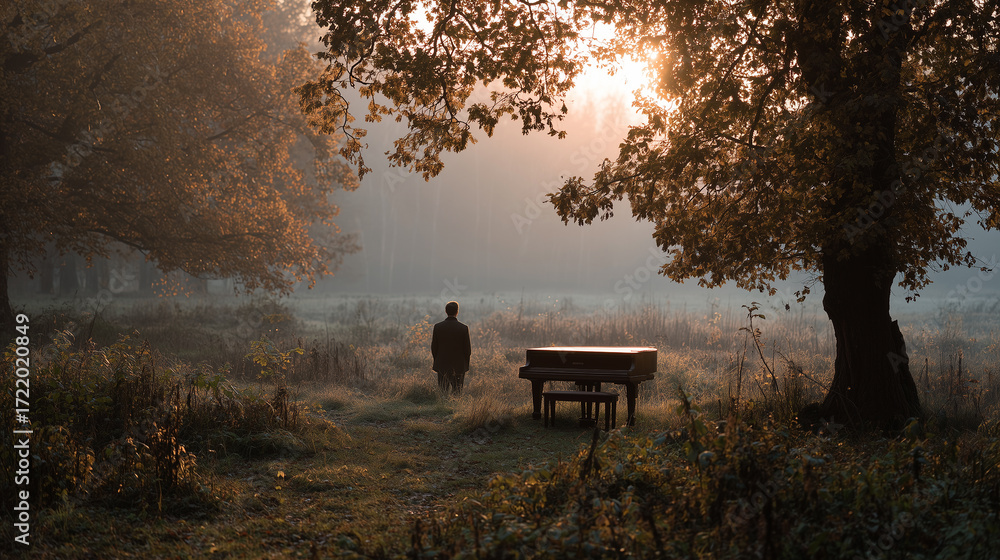 Muzyka - Mistyczne zdjęcie fortepianu w lesie, z muzykiem w oddali, oświetlone promieniami wschodzącego... #1722020849