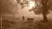 • Mistyczne zdjęcie fortepianu w lesie, z muzykiem w oddali, oświetlone promieniami wschodzącego słońca, tworzące sielską atmosferę.