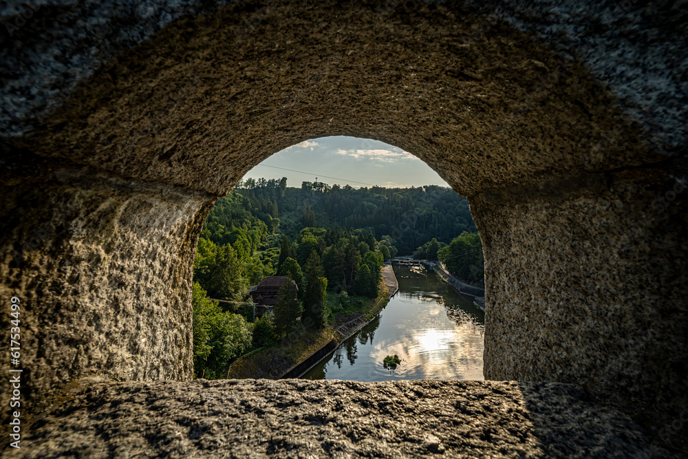 • Zapora Pilchowice – najwyższa zapora kamienna i łukowa w Polsce (Województwo Dolnośląskie). Widok na rzekę w dolnej części zapory.