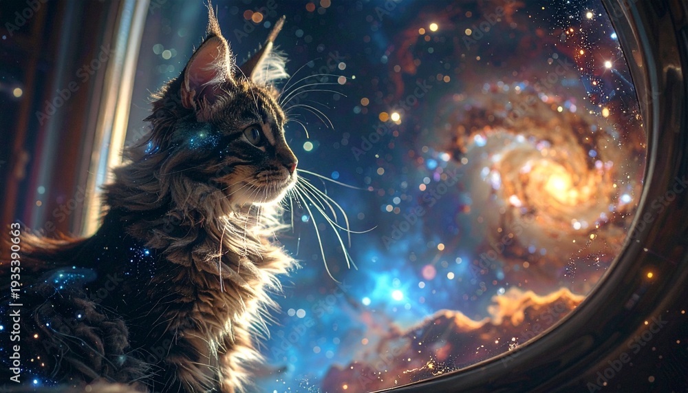 Kosmos - A curious cat gazes out a space window at a vibrant galaxy with stars. #1935390663