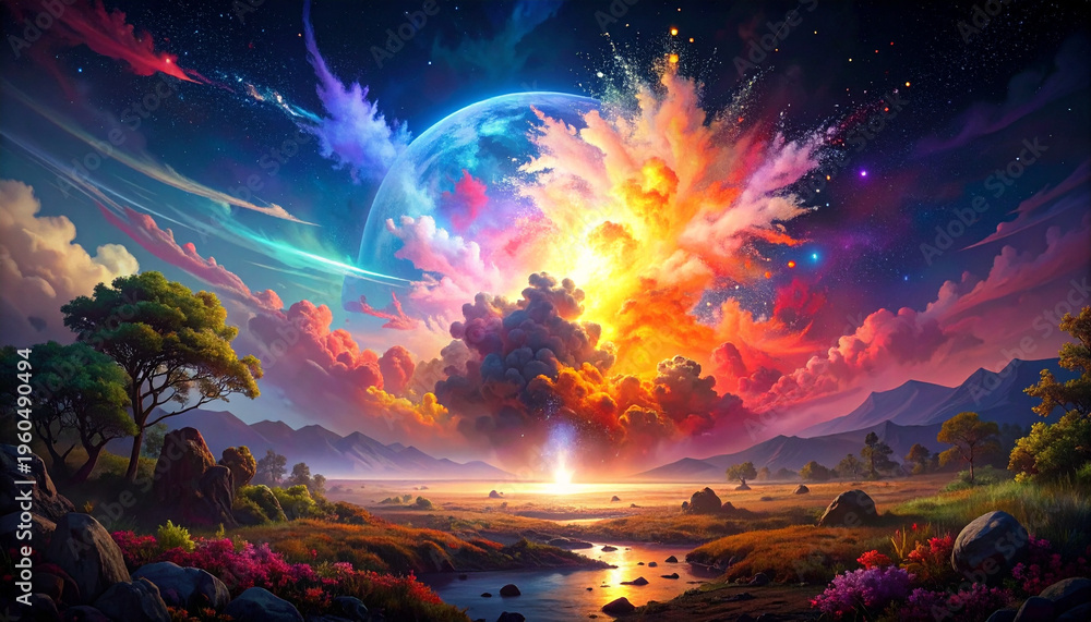 Kosmos - Cosmic explosion landscape painting vibrant colors dramatic celestial scene #1960490494