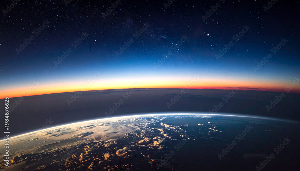 Kosmos - Earths curvature with atmospheric layers and stars during a twilight scene #1984876625