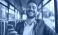 • Uśmiechnięty mężczyzna w słuchawkach jedzie autobusem miejskim