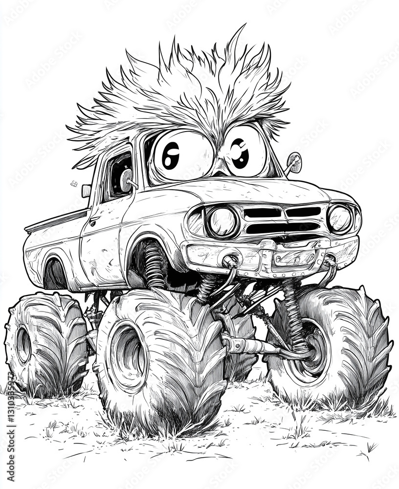 Monster truck - kolorowanka dla dzieci - Ilustracja czarno-biała - Samochód na dużych kołach,