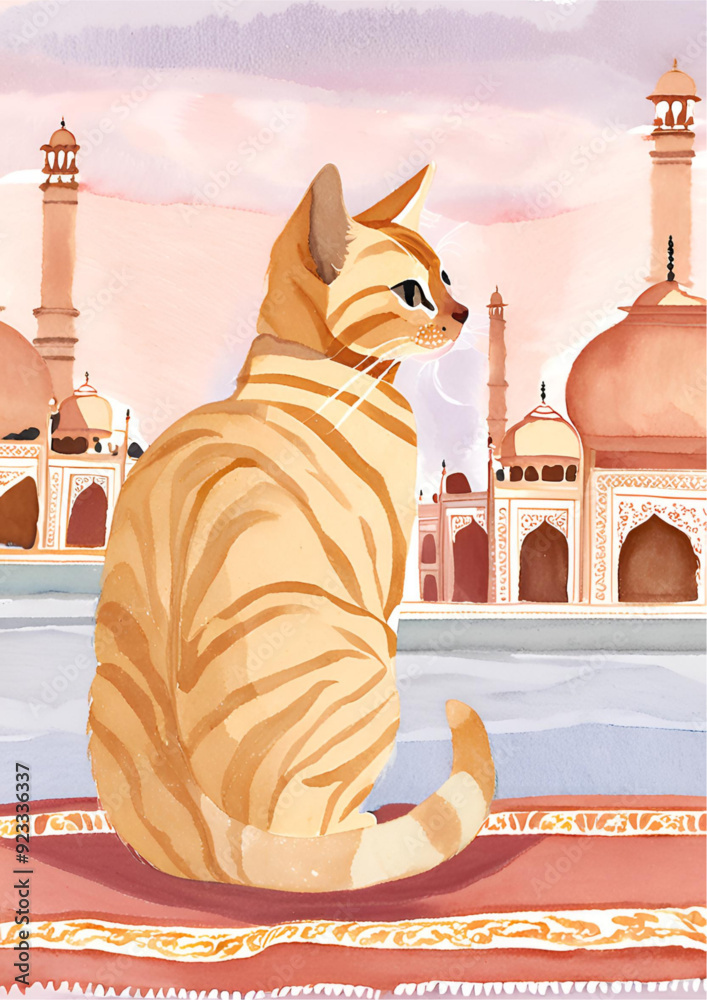Mały kot, kotek siedzi na schodach przed wejściem do domu
