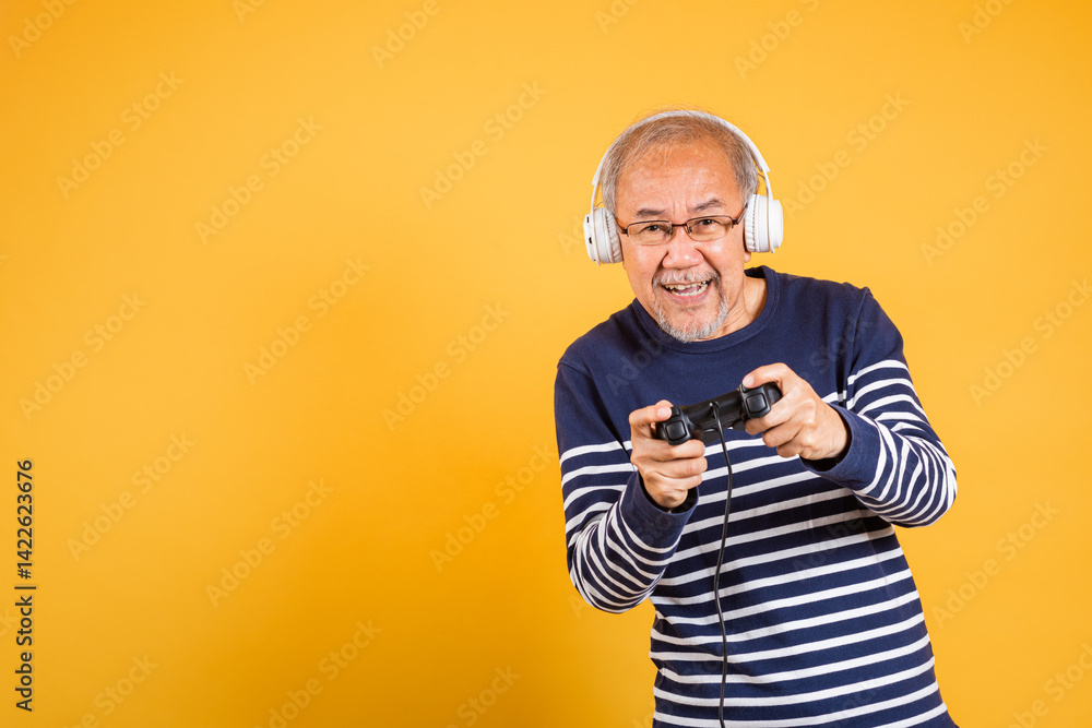 Portrait Asian smiling old man with headphones holding game controller studio shot isolated yellow background, senior man pensioner feeling winning playing a video game with joystick console