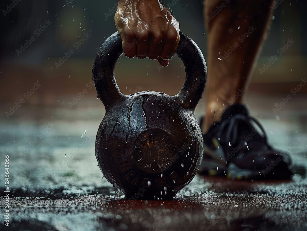 Sport - strong grip on kettlebell in rainy workout setting #1246643055
