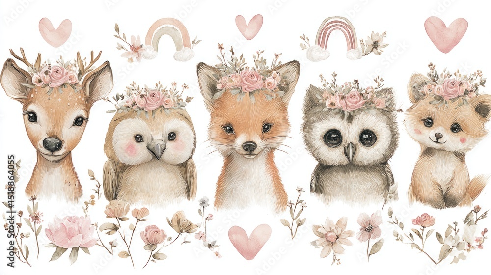 • Hand-drawn woodland baby animals with flower crowns and rainbows, includes deer, fox, squirrel, and owl, soft boho tones, surrounded by floral elements and hearts, ideal for nursery wall art.