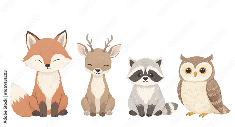 Zwierzęta - Cute woodland animals illustration, adorable fox, deer, raccoon, owl characters, cartoon animals,... #1669131203
