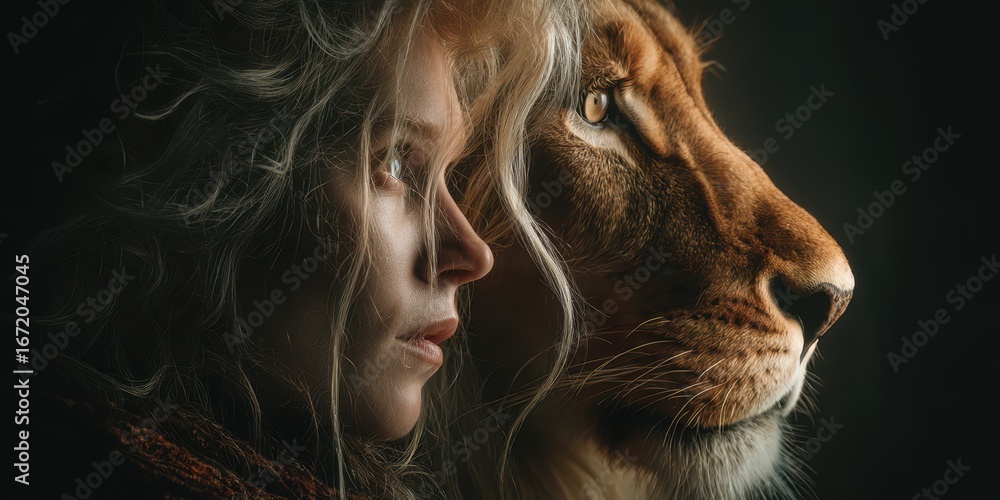 Zwierzęta - Merging of human and lion in a striking artistic portrayal of strength and spirit #1672047045