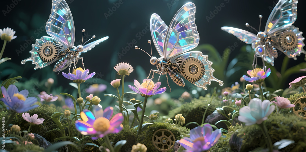 Zwierzęta - Steampunk Butterflies Hovering Over a Vibrant Floral Garden #1679545516
