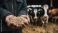 • Farmer holding animal feed grains in hands with dairy cows in the background, symbolizing livestock farming, agriculture, organic production and sustainable food industry.