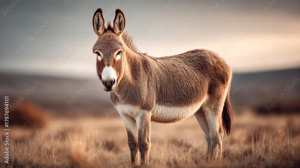 Zwierzęta - A lovely donkey in a field gazes directly at the camera during daylight hours. #1787694101
