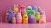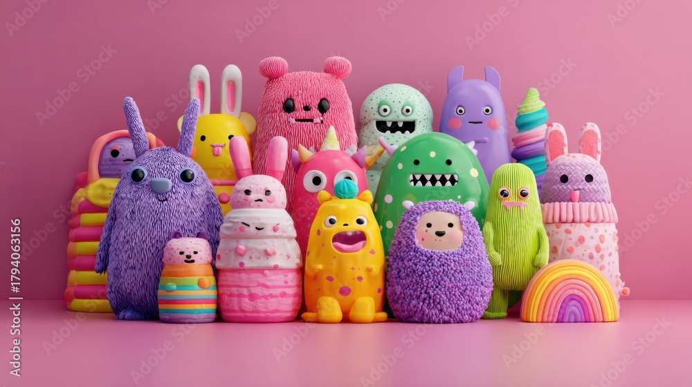 • Cute and Colorful Plush Toys Displayed on a Vibrant Pink Background with Fun Characters and Whimsical Designs